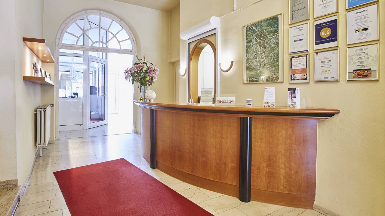 Direkt buchen!Die herrlich ruhige, familiäre Atmosphäre, der persönliche Service und die attraktiven Preise machen unser Haus zu einem idealen Domizil für Geschäftsreisende, Tagungsgäste, Familien und Besucher unserer sehenswerten Stadt. Unsere 33 geräumigen, neu gestalteten Zimmer und eine Suite verfügen über Bad/WC, Kosmetikspiegel, Haartrockner, Matratzen mit Matrix- Gütesiegel, Telefon, Kabel-TV, gratis WLAN sowie teilweise Balkon und bieten Ihnen all den Komfort, den Sie sich wünschen. Täglich lädt Sie ein reichhaltiges Buffet in den gemütlichen Frühstücksraum ein, welches wir Ihnen von 06:30 Uhr bis 11:00 Uhr servieren. An der hoteleigenen Bar oder im Sommer auf unserer Terrasse können Sie jederzeit Erfrischungen einnehmen. Sie dürfen sich auf einen unvergesslichen Aufenthalt freuen, umgeben von der charmanten Kombination aus Tradition und Moderne, die das einzigartige Flair unseres Hauses prägt. Mit W-LAN kostenlos ins High Speed Internet, das gibt es nur im Hotel Schweizer Hof! Genießen Sie den Ausklang des Abends bei einem gemütlichen Glas Wein an unserer Bar oder im Sommer auf unserer Gartenterrasse. Wir sind immer für Sie da und helfen Ihnen gerne mit Informationen, damit Sie Ihren Aufenthalt in Baden-Baden richtig genießen können.