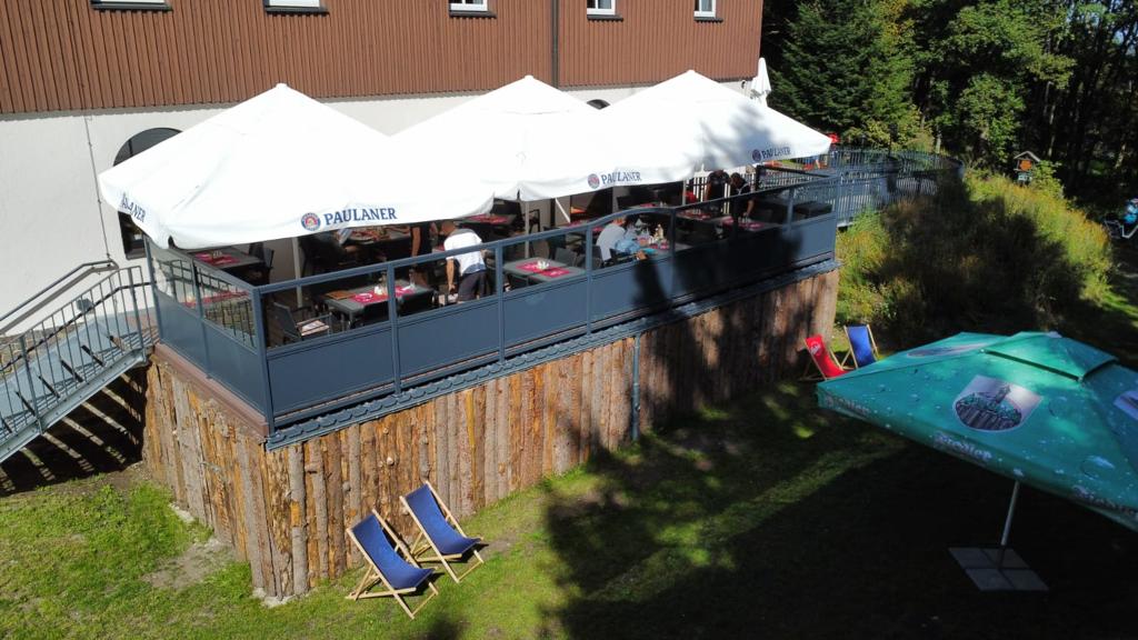 Verschiedene Wanderwege befinden sich um unseren Berg mit dem Höhepunkt des Gipfelkreuzes am Goldkämmerle. Die Aussicht über die Talsperre Cranzahl sollten Sie sich nicht entgehen lassen und wenn Sie noch weiter schauen möchten, steht Ihnen jederzeit unser Aussichtsturm zur Verfügung. Wenige Gehminuten entfernt befindet sich der Grenzübergang zur tschechischen Stadt Weipert. Ein Katzensprung entfernt liegen die Skigebiete in Oberwiesenthal oder auf dem Keilberg in Tschechien, wo Sie im Winter sowohl Skifahren oder Rodeln und im Sommer wandern gehen können.